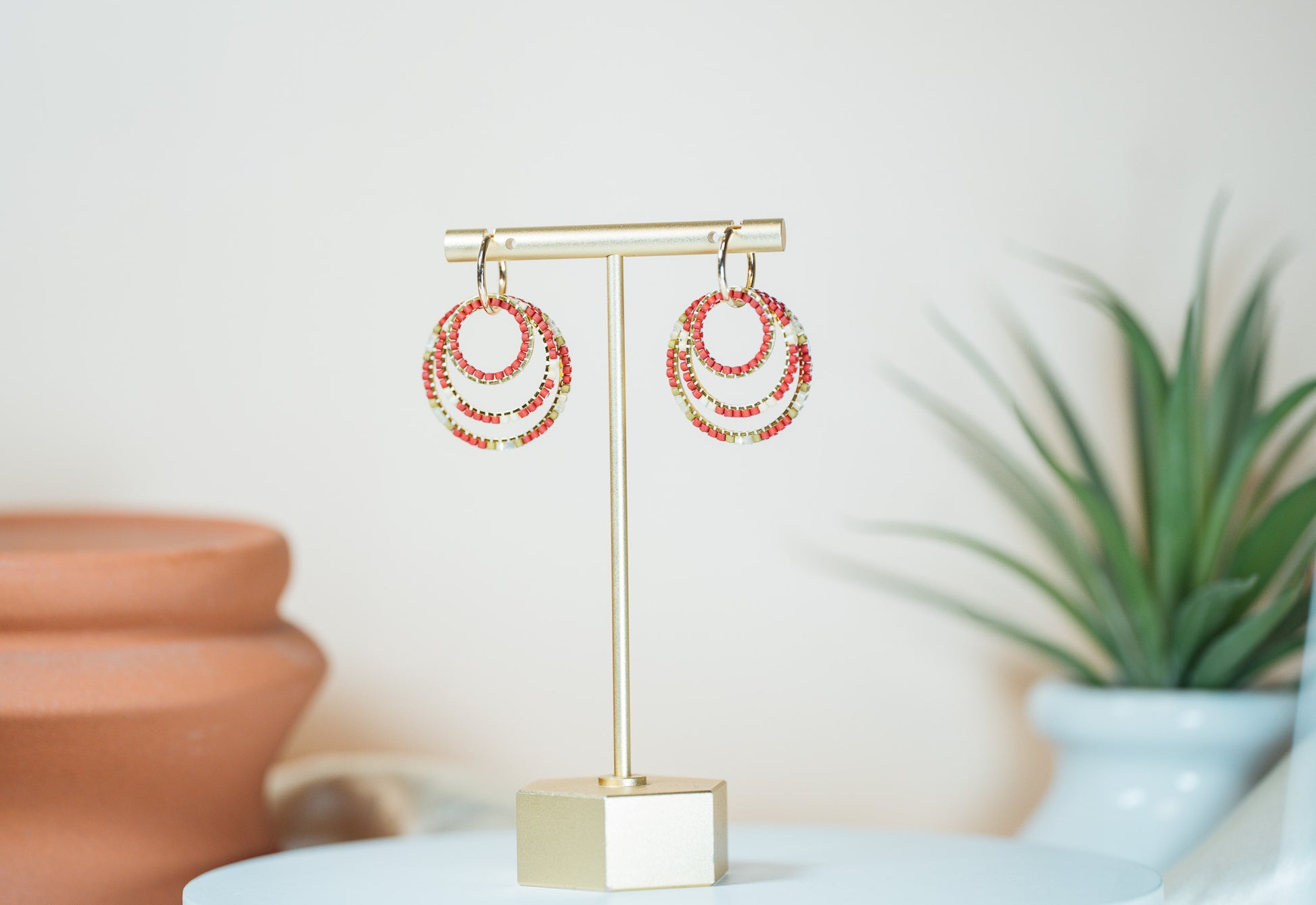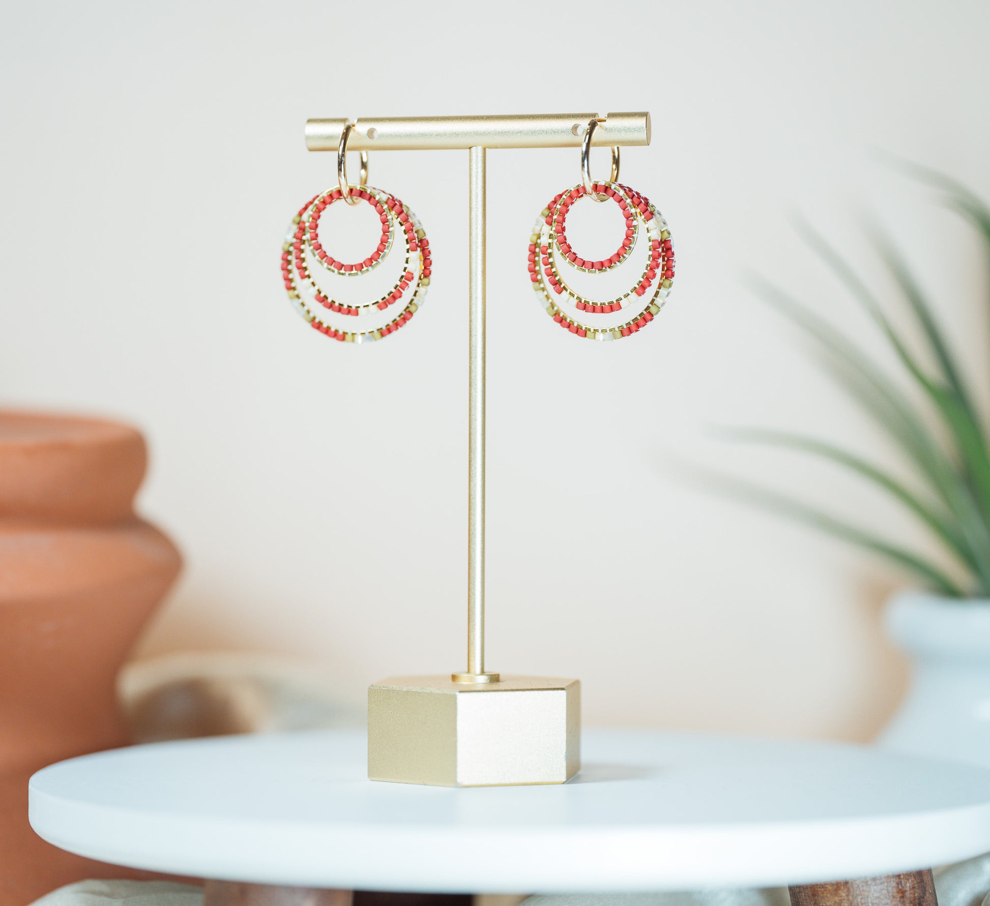 Small hoop earrings with three circles with beads.