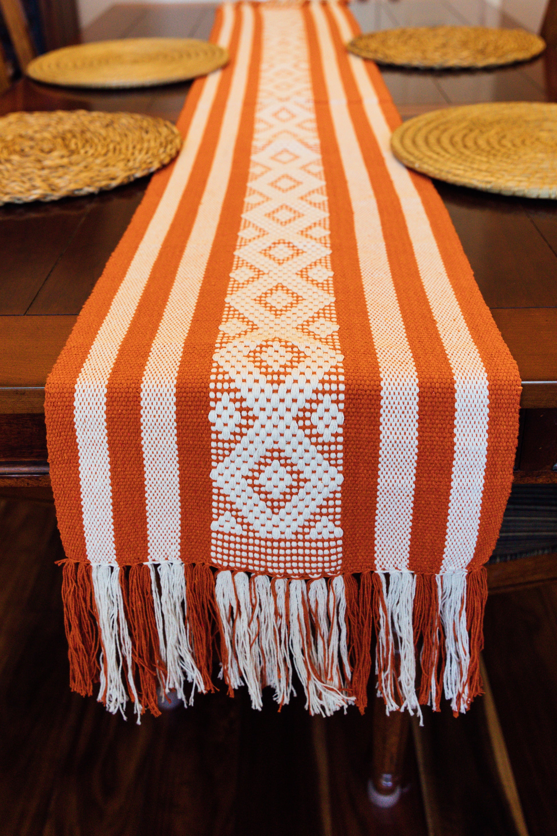 These beautiful table runners were handwoven on a loom in Oaxaca, Mexico by a local artisan. Each table runner takes her 11-12 hours to make. These large-sized runners are 2 meters long (approximately 78 inches) and 33 cm wide (not including fringe). Each one is unique and one-of-a-kind.