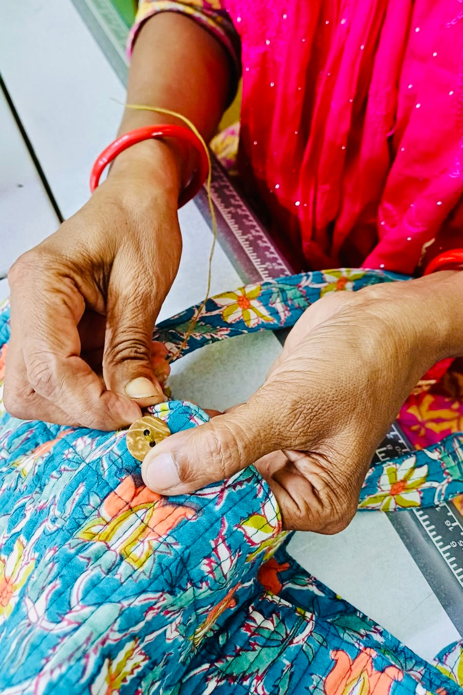 Now, they’re finding hope through meaningful work—sewing bags, dresses, and more by hand. The fabrics come from Jaipur, using traditional hand-block printing methods. As the women sew, they add their own personal touch to every item—no two are exactly the same.