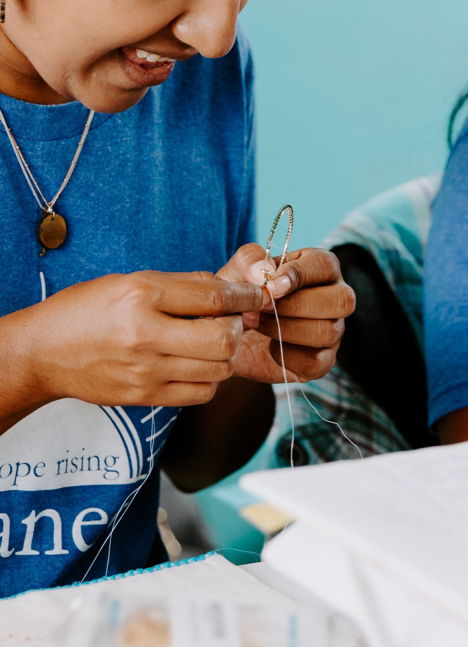 Inez, a devoted single mom, started making jewelry to fund her law education, with the hope of creating a better future for both herself and her son. Our jewelry project empowers young women like Inez, providing them with dignity and hope.